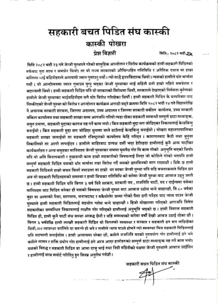 सहकारी बचत पीडित संघ कास्कीले जेनजी पुस्ताको आन्दोलनलाई पूर्ण समर्थन रहेको स्पष्ट पार्दै, यस घटनामा अन्य समूह वा पार्टीका व्यक्तिहरूले घुसपैठ गरी यस्तो कार्य गरेको हुन सक्ने बताएको छ ।