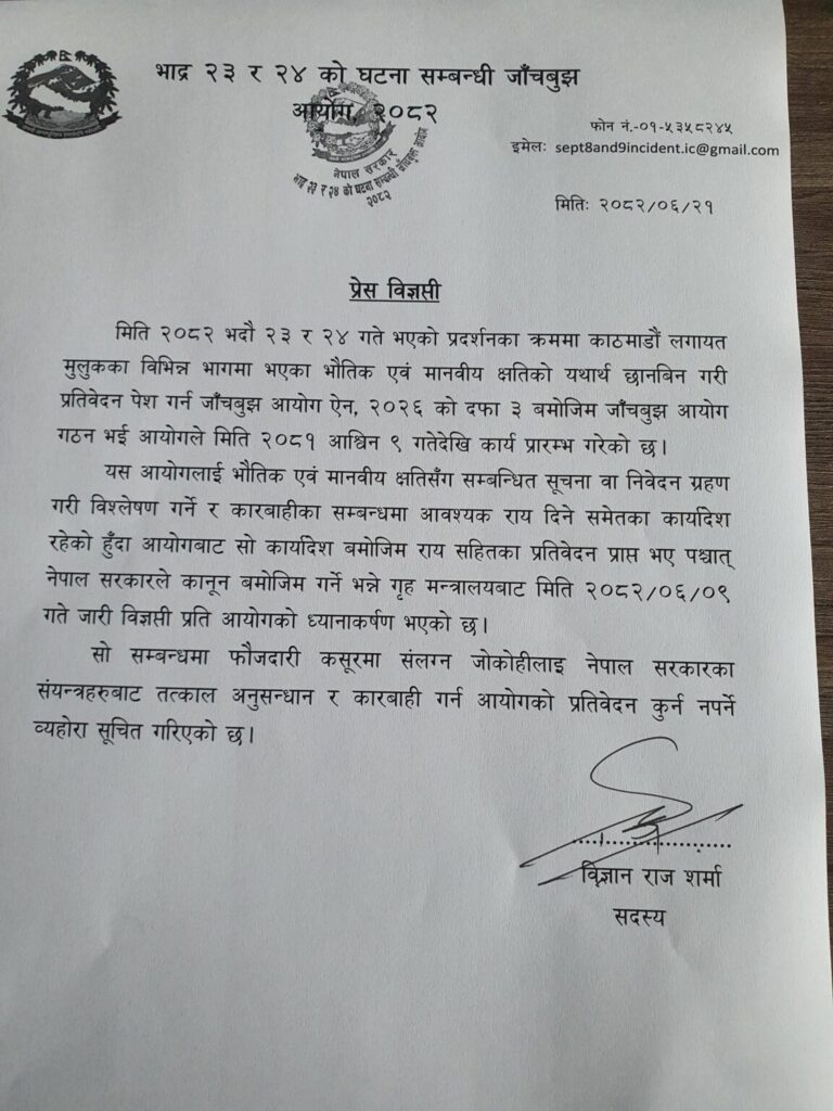 गृह मन्त्रालयले असोज ९ गते जारी गरेको विज्ञप्तिमा ध्यानाकर्षण भएको भन्दै आयोगले सो विज्ञप्ति प्रकाशन गरेको हो । सो आयोगलाई भौतिक एवं मानवीय क्षतिसँग सम्बन्धित सूचना वा निवेदन ग्रहण गरी विश्लेषण गर्ने र कारबाहीका लागि राय सहितको प्रतिवेदन दिने कार्यादेश रहेको जनाएको छ ।