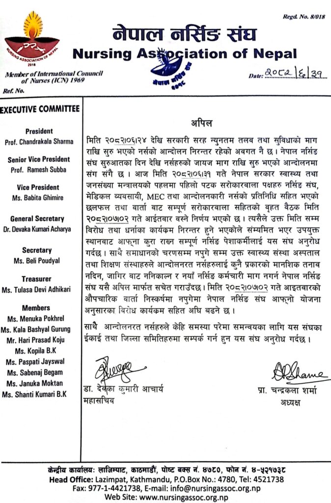 नर्सहरुको आन्दोलनलाई नेपाल नर्सिङ् संघ (नान)ले समर्थन जनाउँदै दबाबका कार्यक्रम आयोजना गरिरहेको छ । यसैबीच, नानले आन्दोलनलाई टुंग्याउन दबाब बढाएपछि आइतबार सम्बन्धित निकायबीच वार्ताको तयारी भएको छ ।