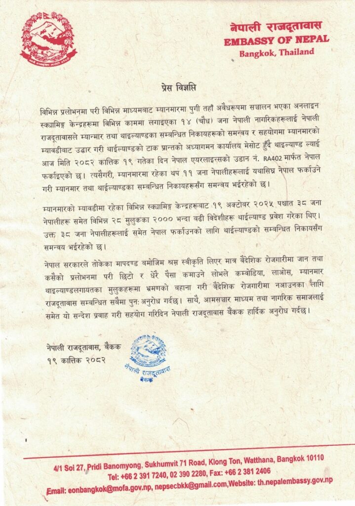 दूतावासका अनुसार म्यानमारमा रहेका थप ११ जना नेपालीको चाँडै उद्धारका लागि पहल भइरहेको छ । म्यानमारको म्यावडीमा रहेका विभिन्न अनलाइन ठगी केन्द्रहरूबाट दुई हप्ताको अवधिमा ३८ जना नेपालीहरू समेत गरी विभिन्न २० देशका दुई हजारभन्दा धेरै विदेशी थाइल्याण्ड प्रवेश गरेका थिए ।