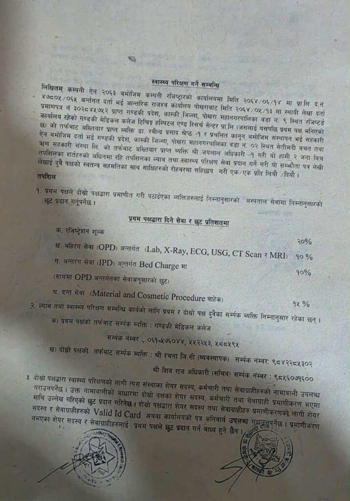 सम्झौता अनुसार सहकारीका बचतकर्ताले अबदेखि जीएमसीले प्रदान गर्ने विभिन्न स्वास्थ्य सेवामा छूट पाउनेछन् ।