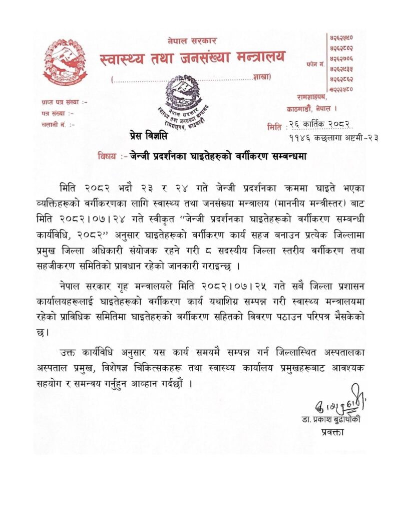 स्वास्थ्य तथा जनसंख्या मन्त्रालयले भदौ २३ र २४ गते जेनजी प्रदर्शनका क्रममा भएका घाइतेहरूको वर्गीकरण सम्बन्धी कार्यविधि, २०८२’ स्वीकृत गरेको छ।