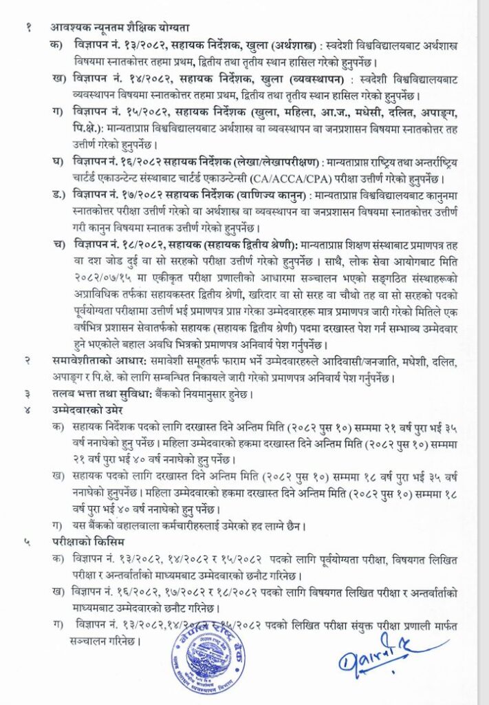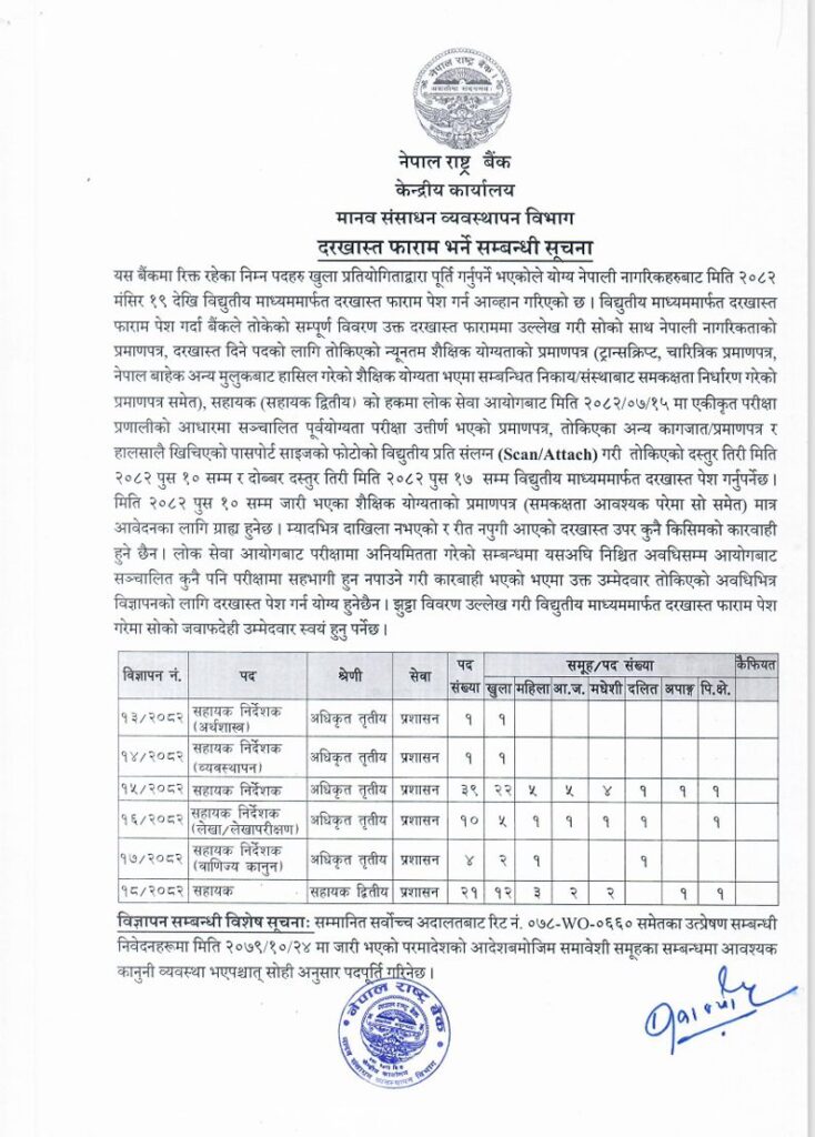 बैंकको केन्द्रिय कार्यालयले आज सूचना जारी गरी पुस १७ गतेसम्म विद्यूतीय माध्यमबाट आवेदन दिन भनेको छ ।
