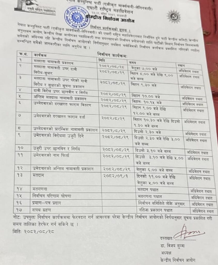 महाधिवेशन केन्द्रीय निर्वाचन आयोगका अध्यक्ष डा. विजय सुब्बाले निर्वाचन कार्यतालिका सार्वजनिक गरेका हुन्।