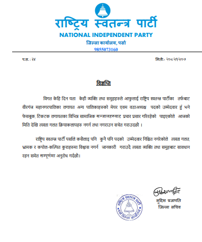 रास्वपा पर्साका सचिव सुदिश प्रजापतिले विज्ञप्ति जारी गर्दै रास्वपा पर्साले कसैलाइ पनि कुनै पनि पदको उम्मेदवार निश्चित नगरेकाले त्यस्ता गलत, भ्रामक र कपोलकल्पित कुराहरुमा विश्वास नगर्न तथा त्यस्ता व्यक्ति तथा समूहबाट सावधान रहन समेत अनुरोध गरेका छन् ।