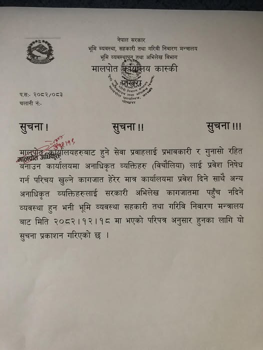 मालपोत कार्यालय कास्कीले कार्यालयबाट प्रवाह हुने सेवालाई थप प्रभावकारी, पारदर्शी र गुनासोरहित बनाउन बिचौलिया वा अनाधिकृत व्यक्तिहरूको प्रवेशमा रोक लगाएको छ ।