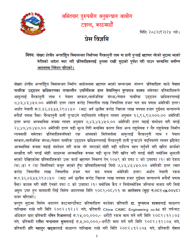 पोखरा क्षेत्रीय अन्तर्राष्ट्रिय विमानस्थल निर्माण आयोजनामा गैरकानुनी लाभ तथा हानी पुर्‍याएको आरोपमा विशेष अदालतबाट भएका आदेशहरू बदर गर्न माग गर्दै सर्वोच्च अदालतमा निवेदन दर्ता गरिएको छ।