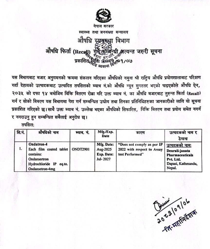 औषधि व्यवस्था विभागले गुणस्तर मापदण्ड नपुगेको भन्दै ओन्डाट्रोन–४ नामक औषधि बजारबाट तत्काल फिर्ता गर्न निर्देशन दिएको छ ।