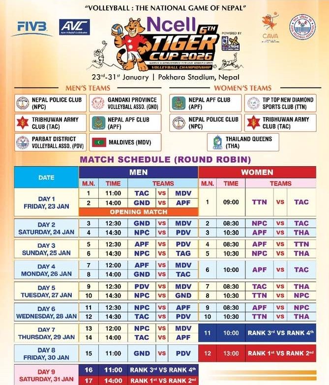 पोखरा । एनसेल छैटौ टाइगर कप भलिबल प्रतियोगिताको खेल तालिका सार्वजनिक गरिएको छ । टाइगर ग्रुप अफ पोखरा नेपालले बुधबार