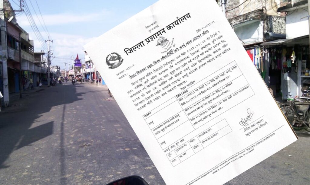 नयाँलिपि । रौतहटको गौर नगरपालिका क्षेत्रमा जारी कर्फ्यु आइतबार पनि कायमै राखिएको छ। जिल्ला प्रशासन कार्यालयले बिहान ६ः३० बजेदेखि ८ः३० […]