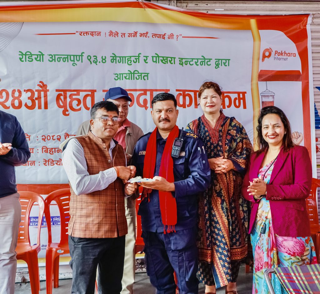 पोखरा । रेडियो अन्नपूर्ण ९३.४ मेगाहर्ज र पोखरा इन्टरनेटको संयुक्त आयोजनामा शनिवार भएको २४ औँ बृहत रक्तदान कार्यक्रममा १ सय